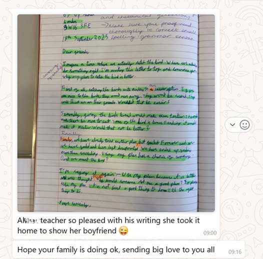 This student’s teacher at school got very excited about his writing progress…!